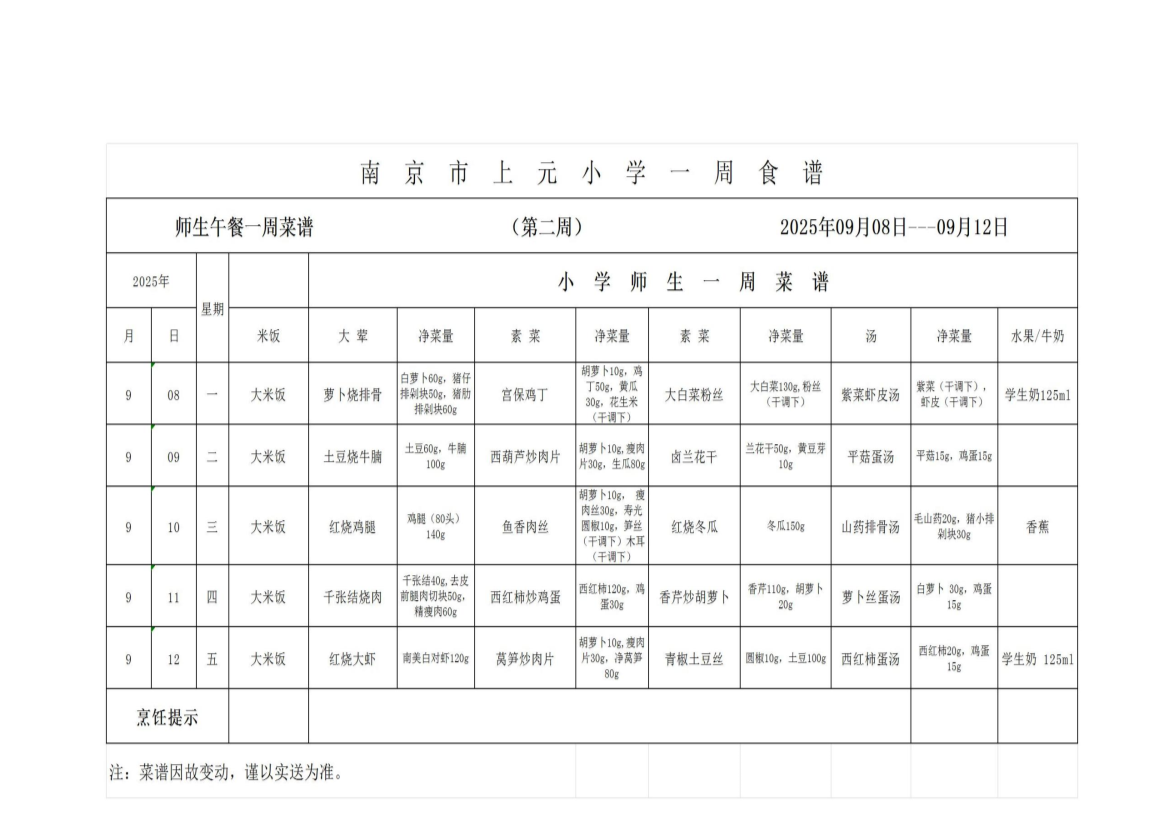上元小学2025-2026第二周菜谱