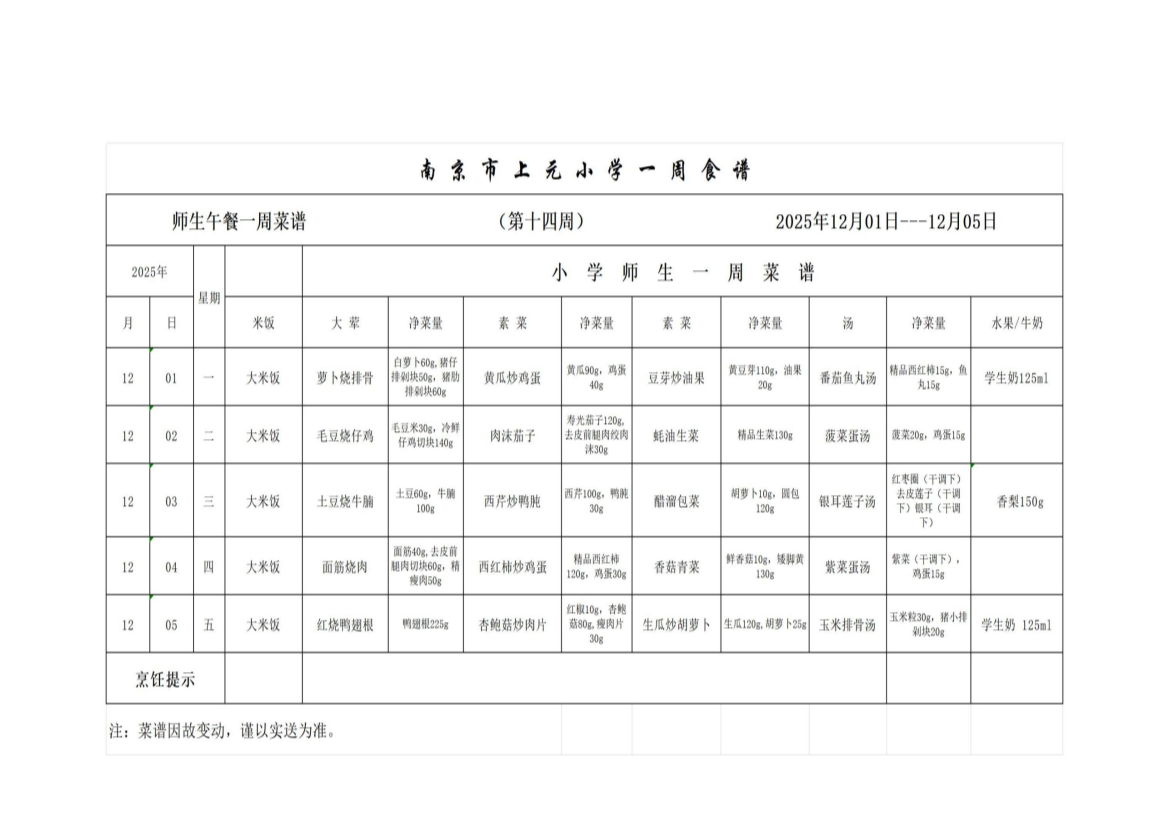 上元小学2025-2026第十四周菜谱
